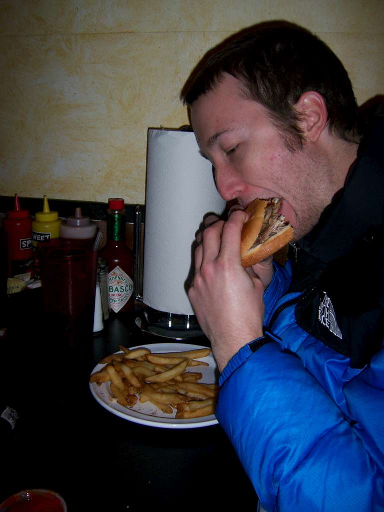 Hanlon's jumbo BBQ pork sandwich, which he is devouring.