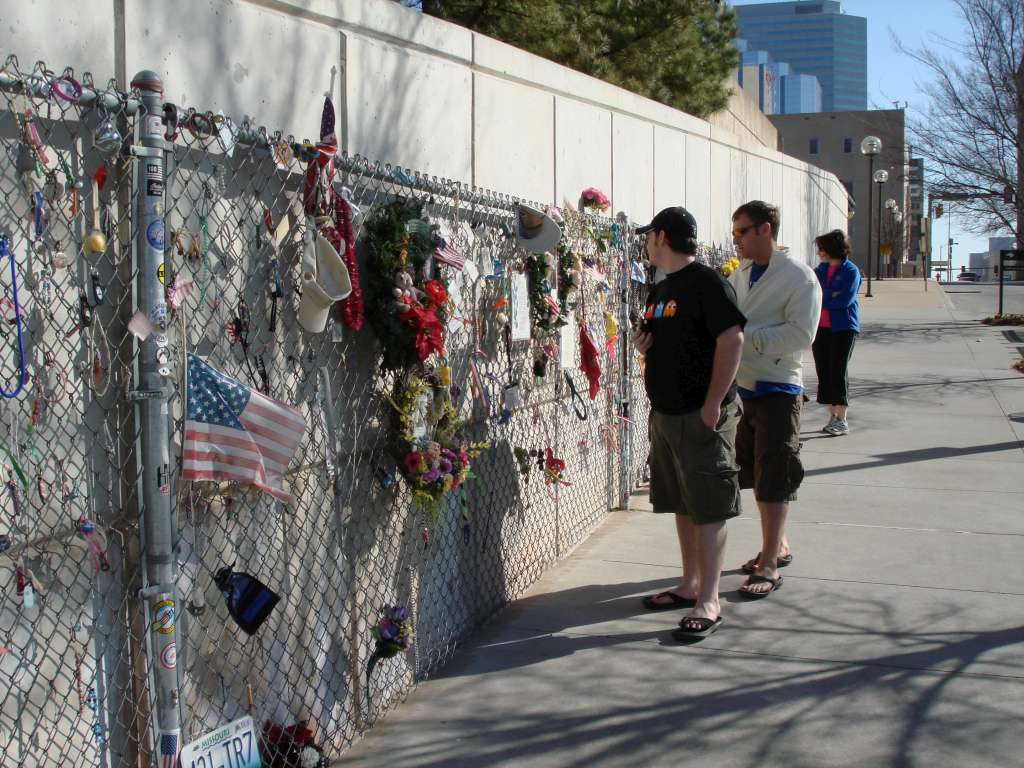 This chain link fence was not originally in the design for the permanent memorial, but it became a staple after it became a place for mourners to show their grief and support.