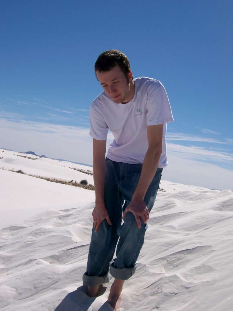 Hanlon exhausted after dragging the sled back up the steep dune.