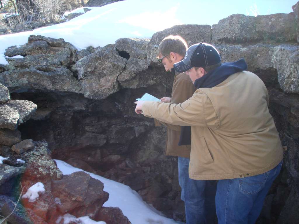 AJ pointing out the wall the Indians built to protect this dwelling cave.
